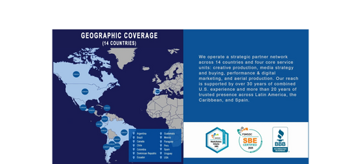We operate through a strategic partner network spanning 14 countries and four core service units: Creative Production, Media Strategy and Buying, Performance and Digital Marketing, and Aerial Production. This network strengthens our value proposition by combining over 30 years of combined U.S. market experience with more than two decades of trusted presence across Latin America, the Caribbean, and Spain.